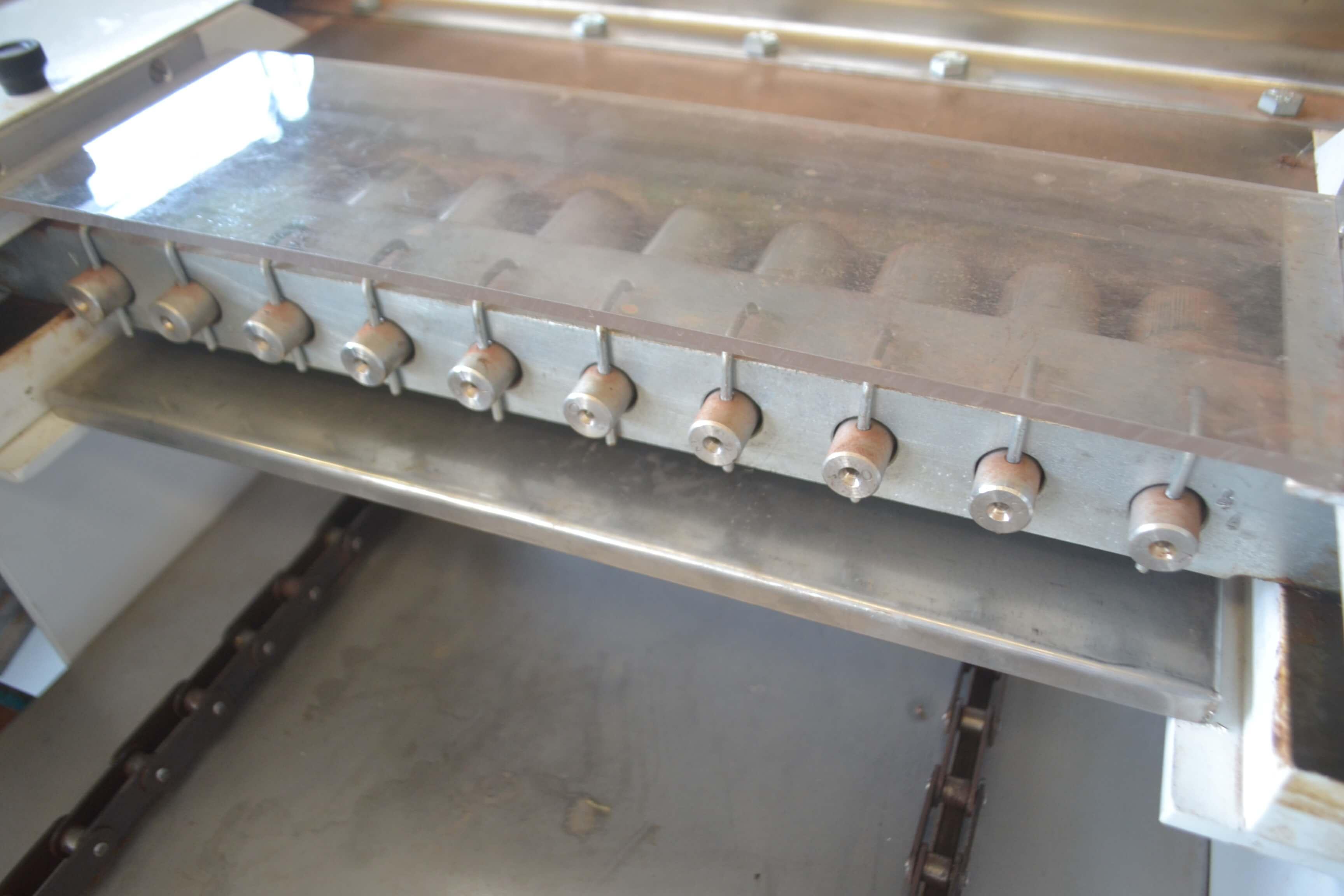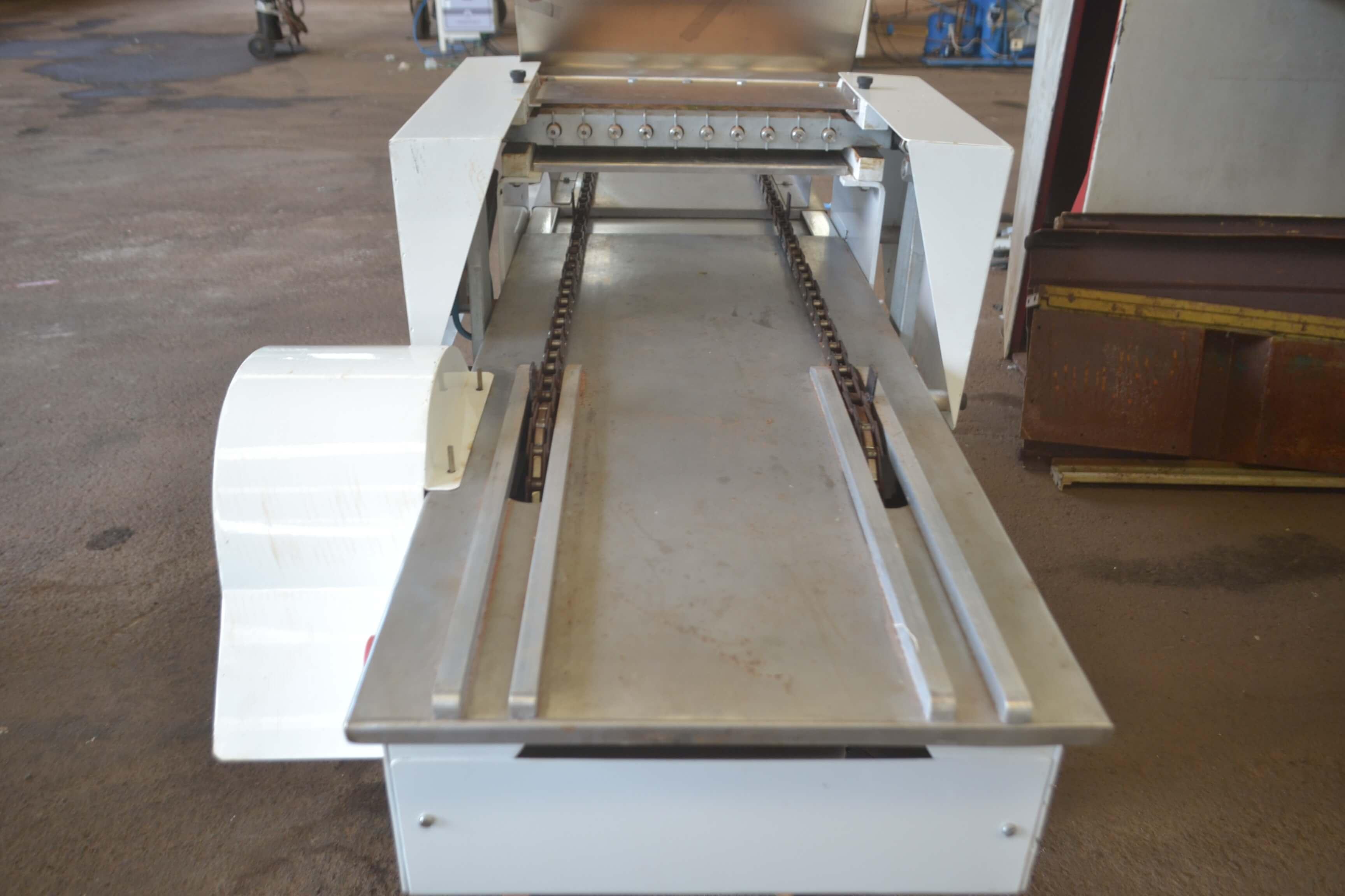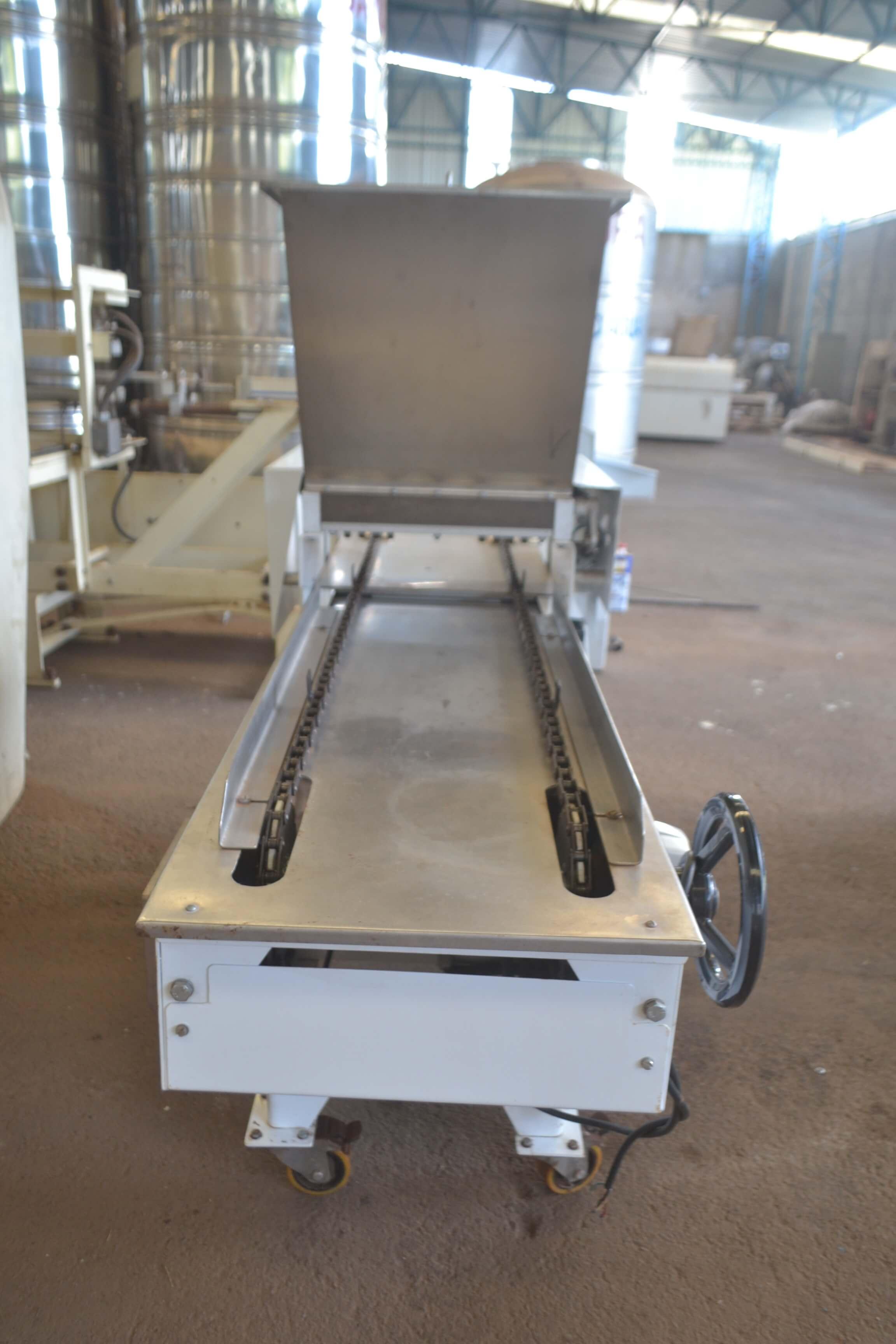 Dosadora para líquidos e semilíquidos 400 mm marca Piróg Modelo: DA-400 Equipamento para dosagem de produtos como suspiros, geleias, balas diet, carolina, biscoito de polvilho (bolinha e palito), biscoito champanhe, bolo inglês, recheios em bolos (colombinho e outros), gel, vaselina, shampoo, graxas e outros produtos. Dosagem em formas, assadeiras, potes, garrafas e outros recipientes. Com CLP para transporte das formas. Características do Equipamento: - largura: 750 mm - comprimento: 2150 - altura: 1750 mm - largura do trilho: 300 mm - 8 Bicos - voltagem: 220 trifásica - modelo: DA-400