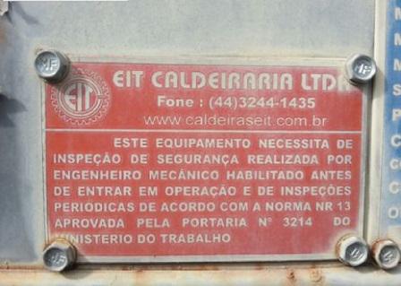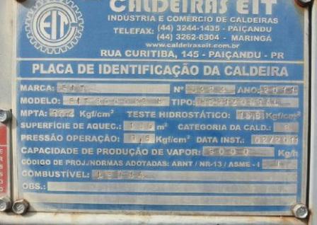 Caldeira marca EIT com capacidade de 3 ton/hora nova/sem uso. Pressão: 10,5 Kg. Queima: anti-fornalha.