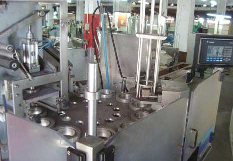 Envasadora rotativa marca Bisignano com CLP Allen-Bradley, para embalar produtos pastosos como sorvetes e doces em potes. Possui sistema de envase automático, dispenser de potes e tampas com lacre e corte com bobina de alumínio. Produção de 2500 potes/ hora.