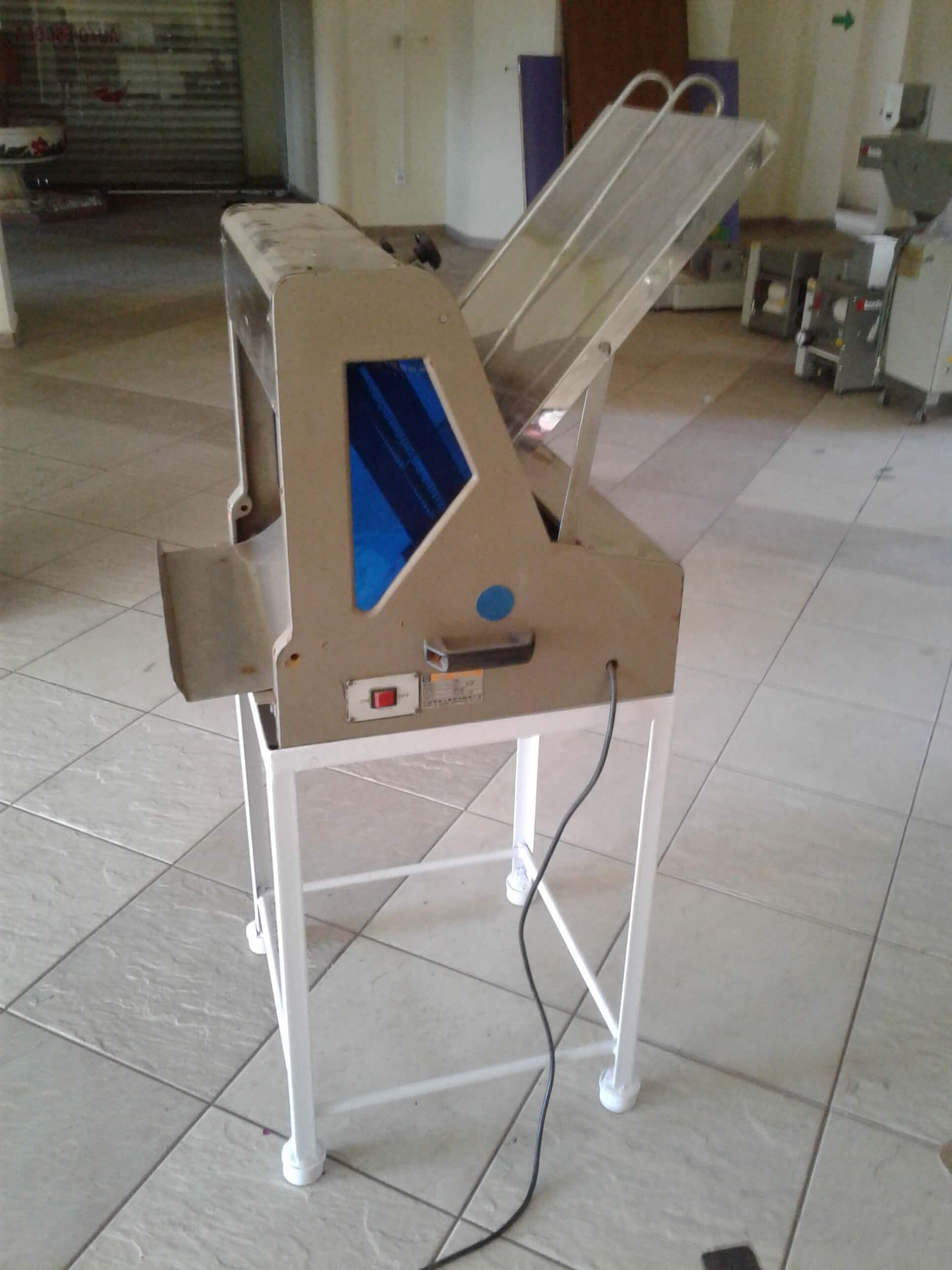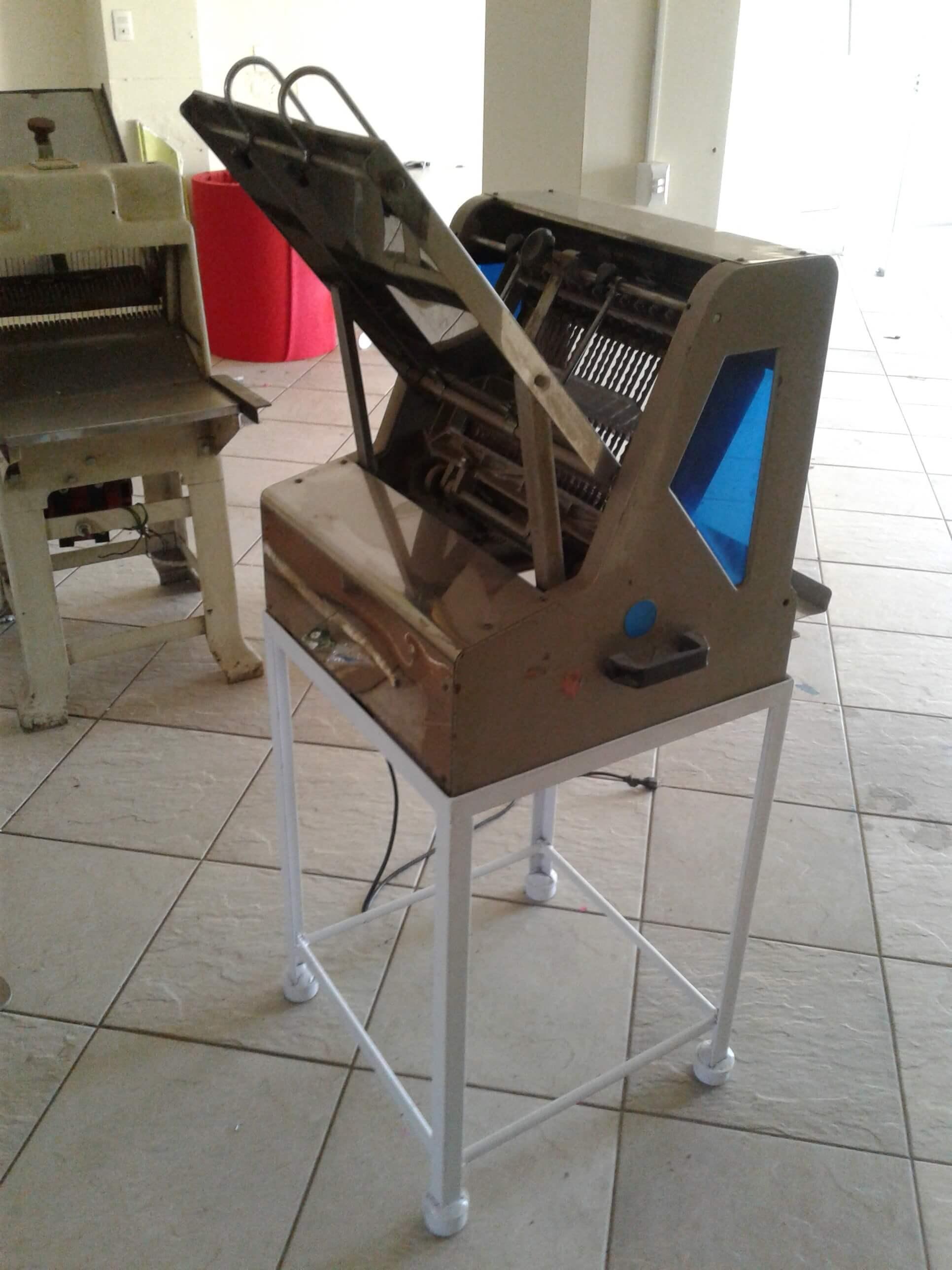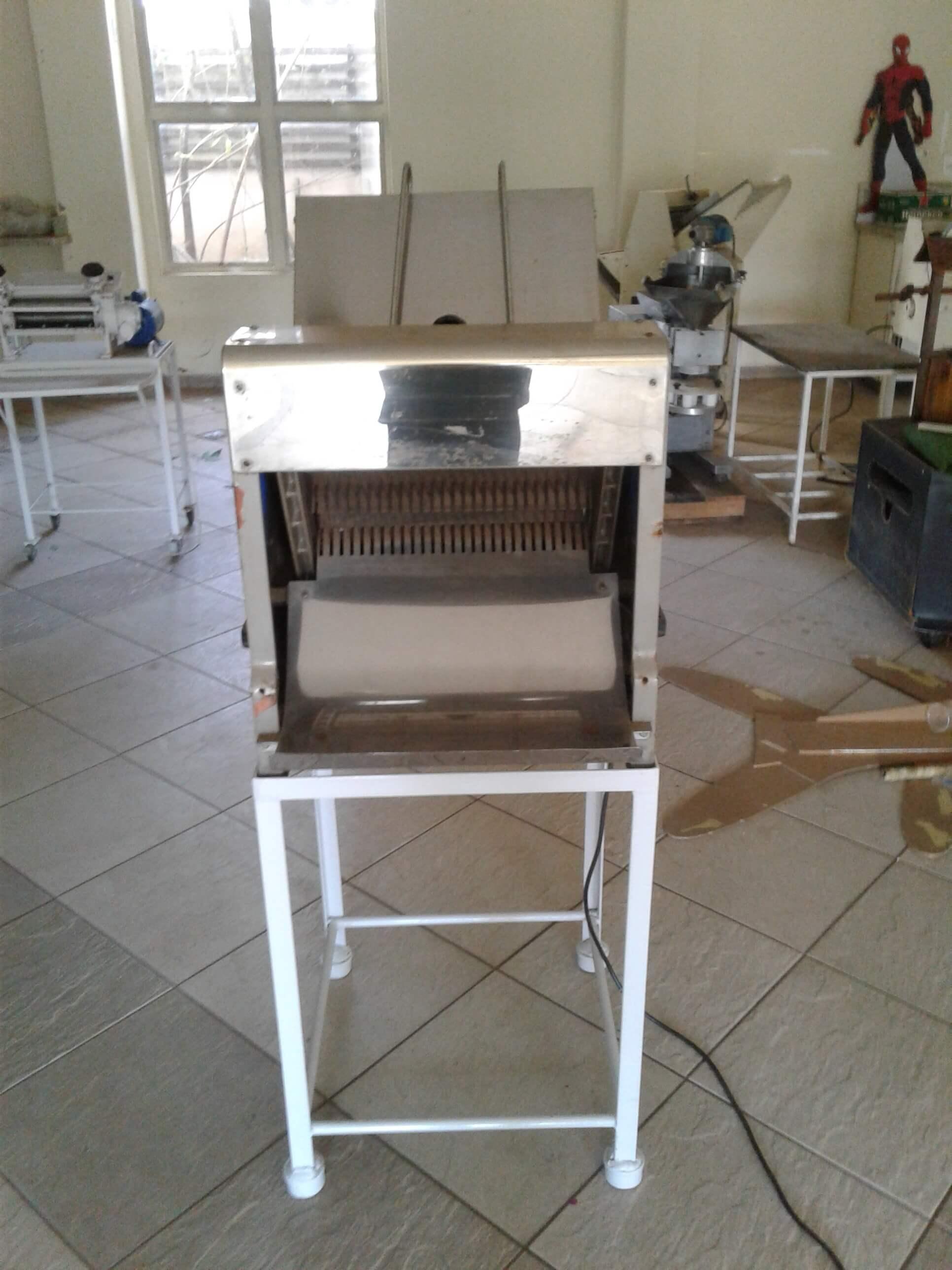 Fatiador de Pão de Forma Pan Pacific - em Aço Inox e Aço Carbono - Marca: Pan Pacific - Voltagem: 220 volts - 27 facas Dimensões do Equipamento: Altura: 1400 mm Largura: 530 mm Comprimento: 650 mm