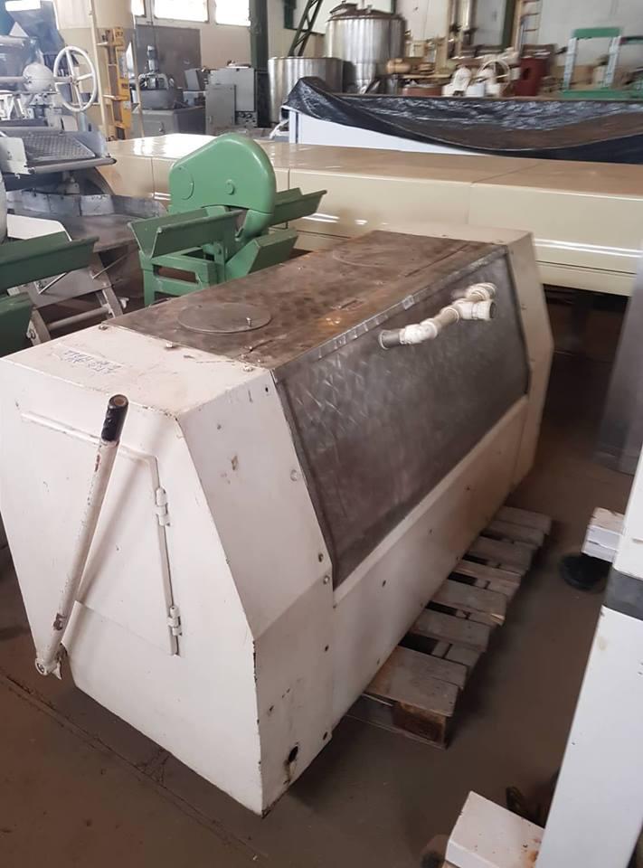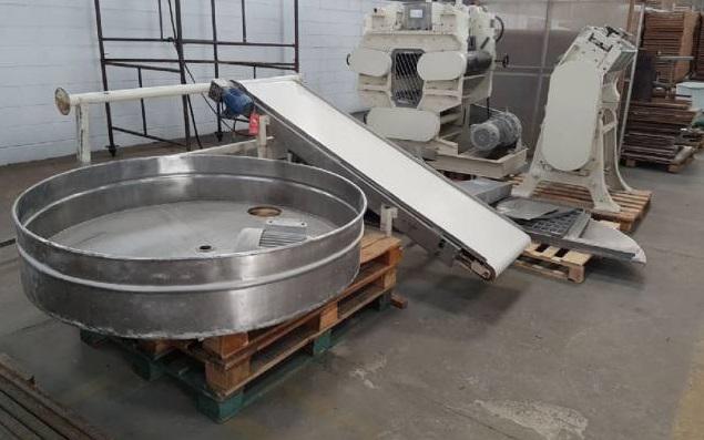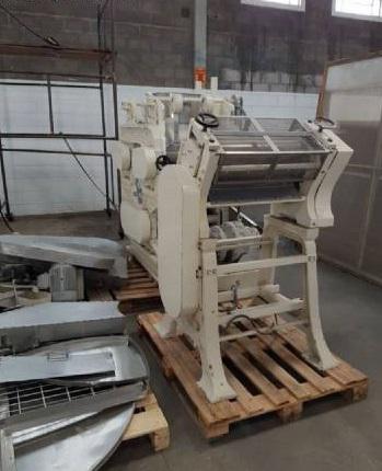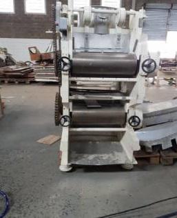Linha de esfolhamento de massas. Composta de: Masseira, bacia alimentadora em inox, esfolhadeira com 6 rolos e calibrador. Espessura da folha produzida - entre 6 e 8 mm