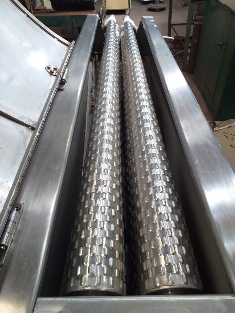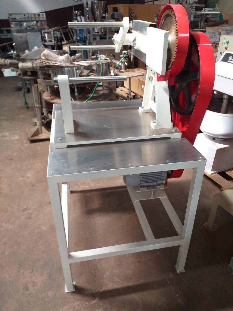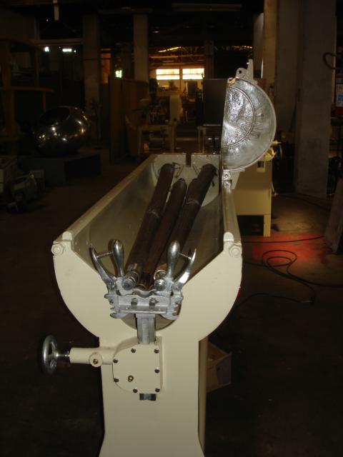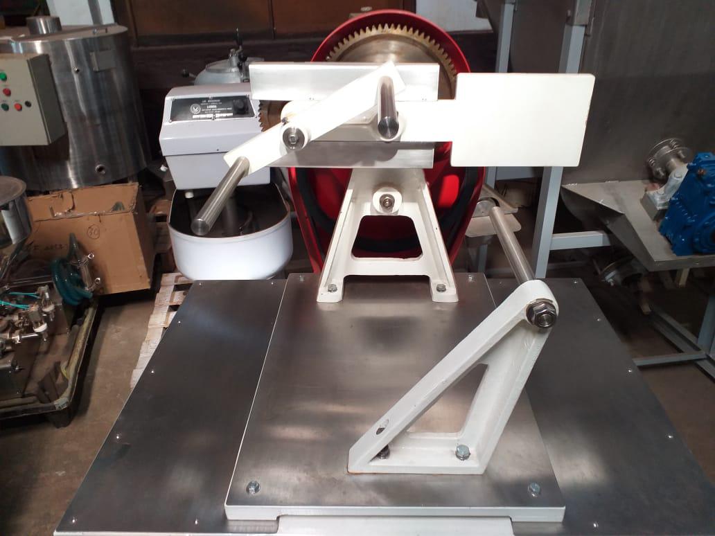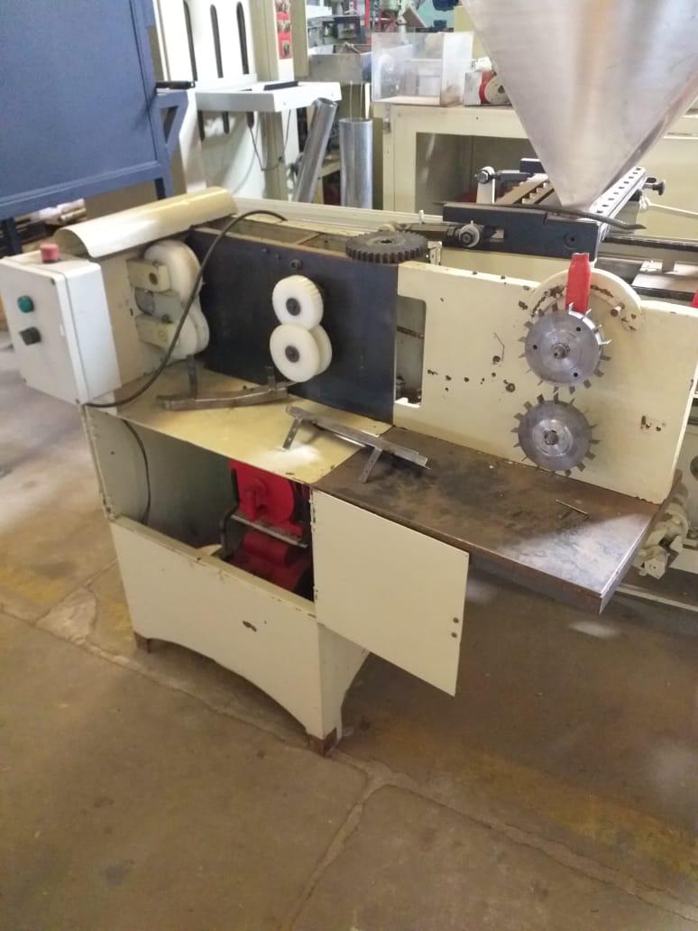 Linha de fabricação de balas de coco. Composta de Tacho cozinhador à gás, puxador, bastonadeira em aço inox total, trafila com corte e mesa de resfriamento em aço inox (1.20 m x 700 mm). Produção aprox. 30 Kg/batelada.