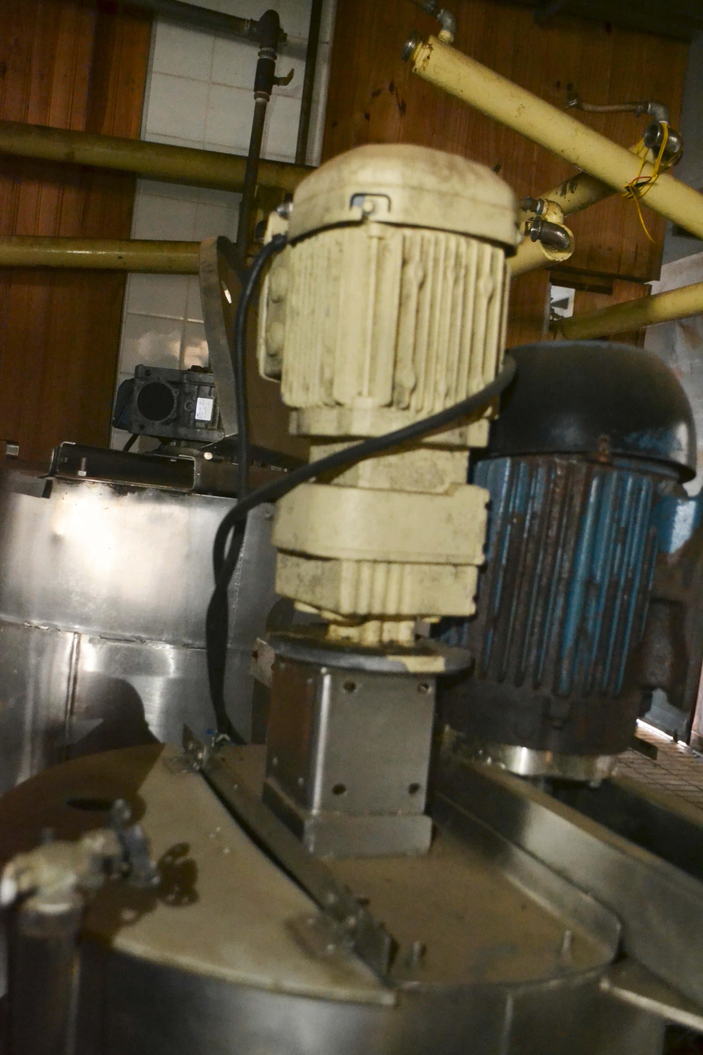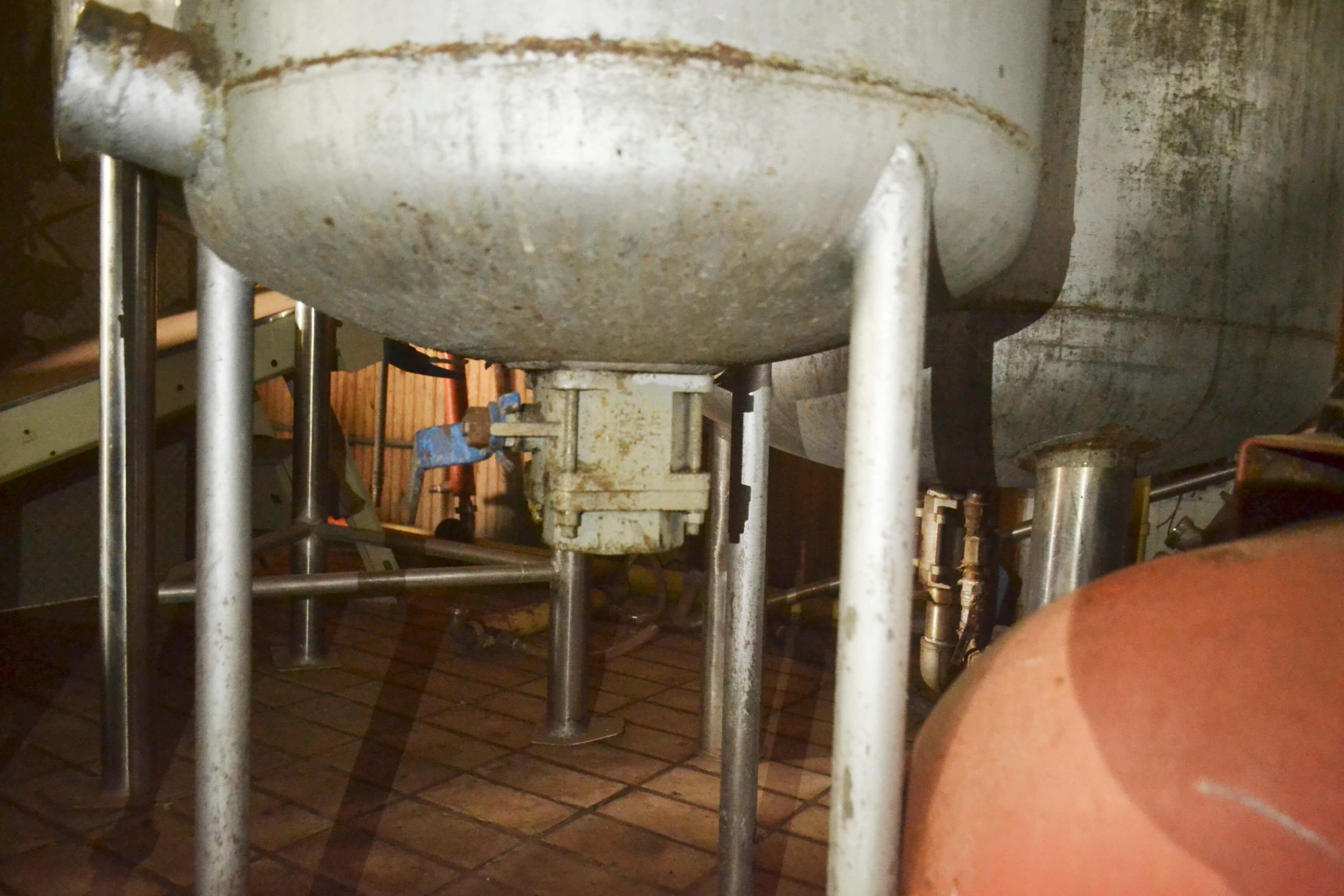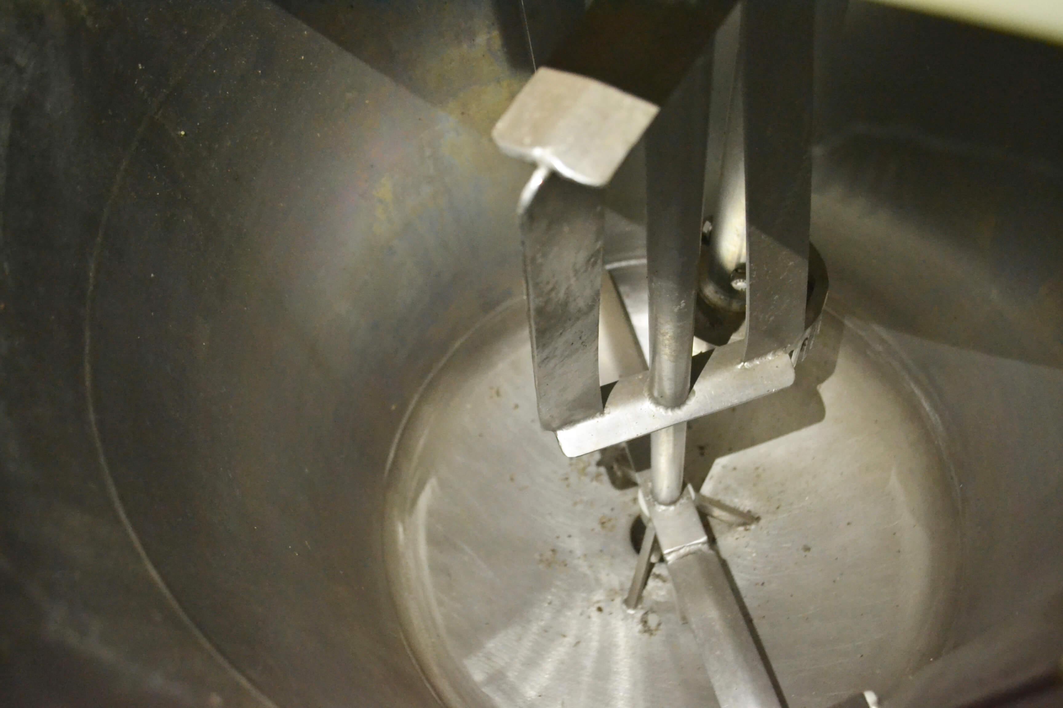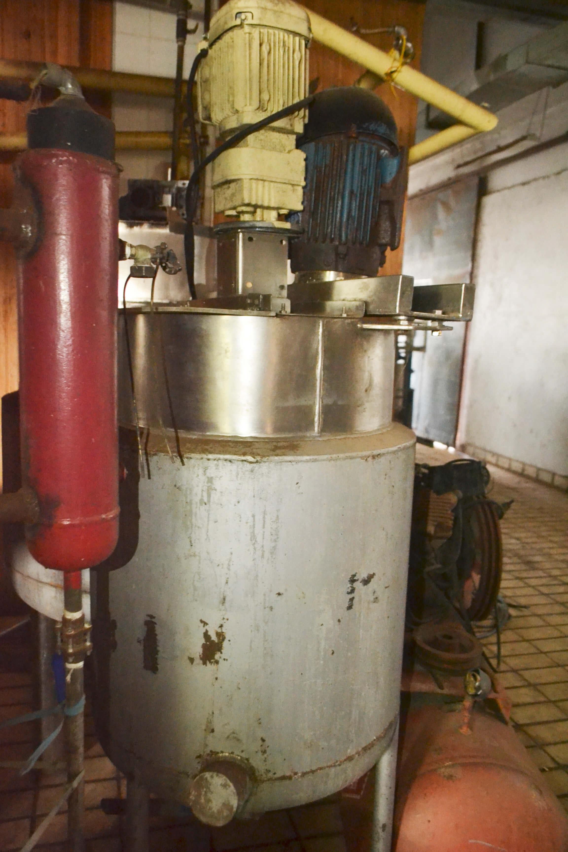 Equipamento encamisado, à vapor, com camisa externa em aço carbono e interna em aço inox. Com mixer para emulsificação do produto e mexedor.