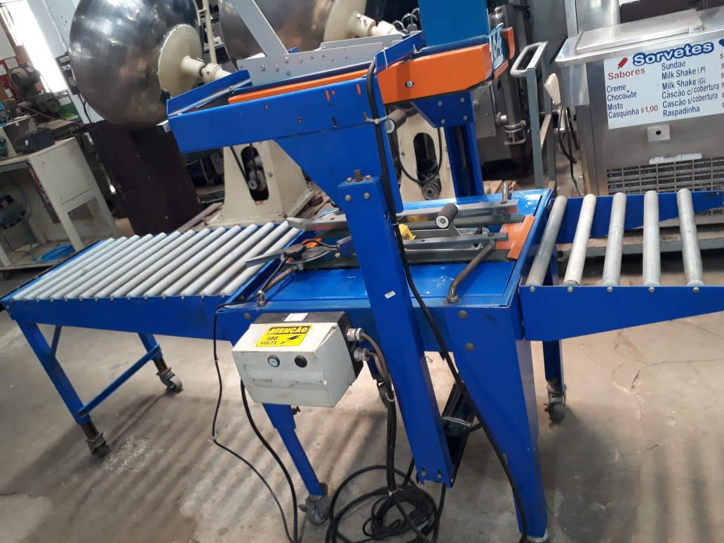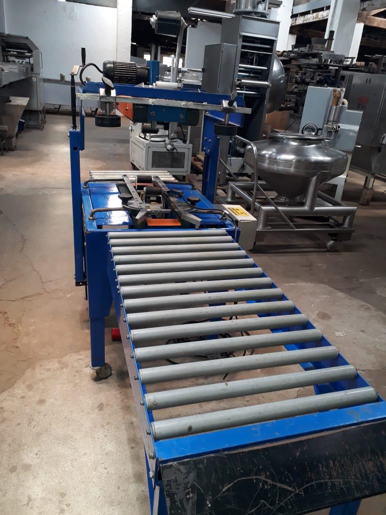 Seladora de caixas de papelão Cyclop. Equipamento com mesa de entrada e saída e fechamento final dem formato U.