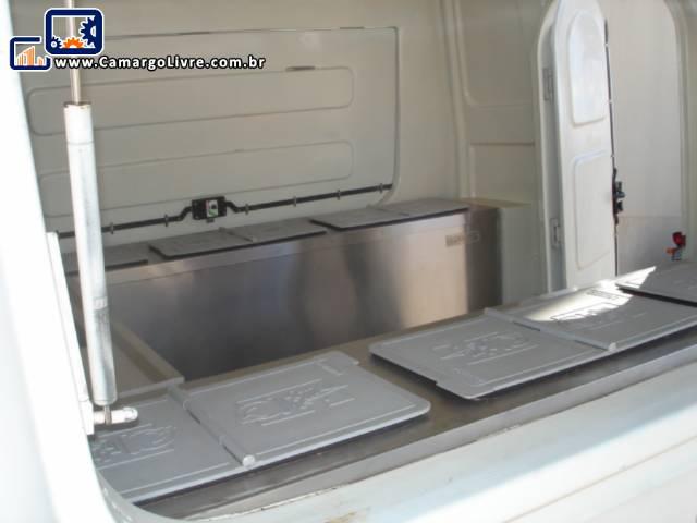 Trailer fabricado totalmente em fibra de vidro, equipado com 2 freezers com placa de congelamento, iluminação interna, reservatório de água e pia.