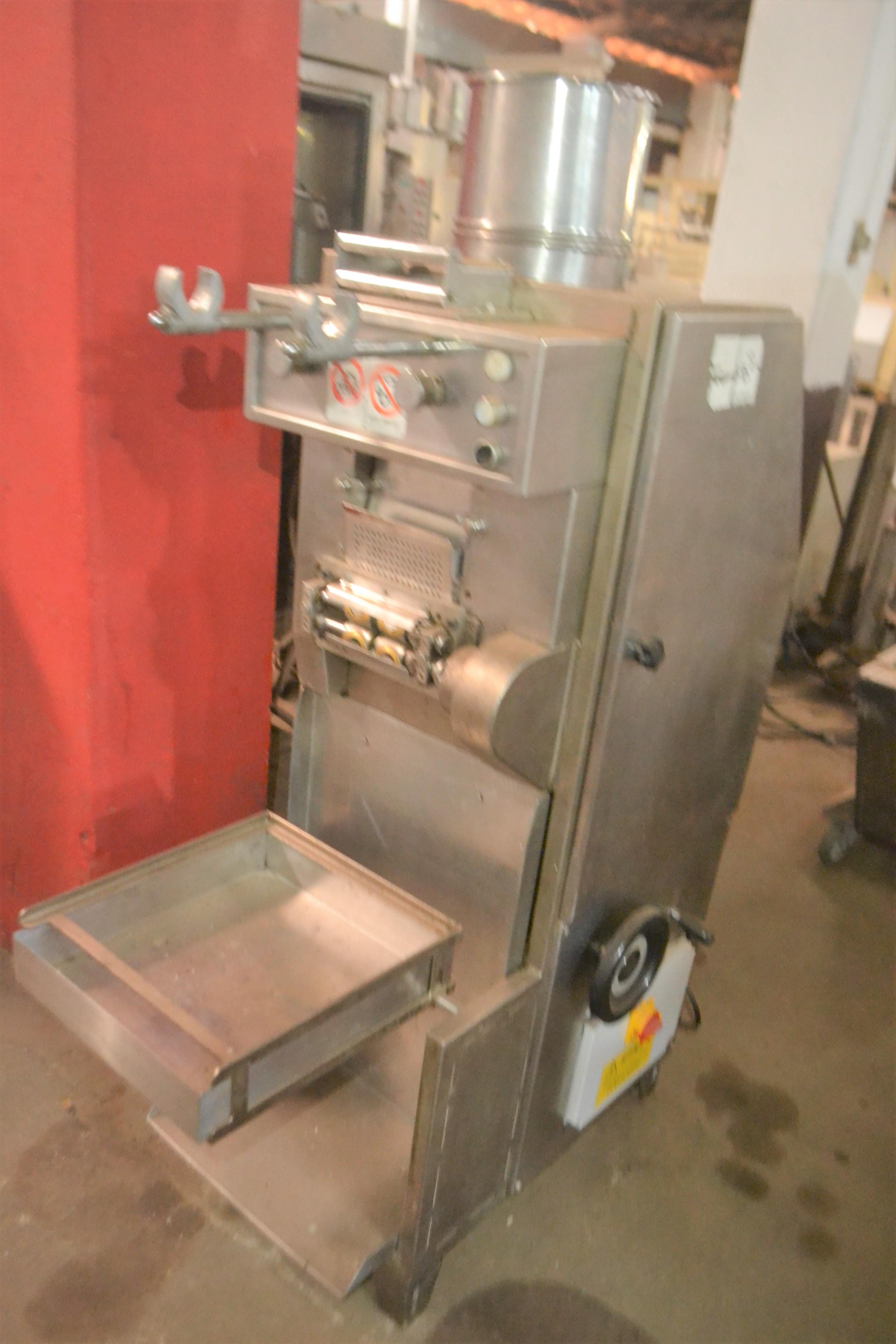 Capeleteira e ravioleteira 20 Kg/h marca Torresani. Modelo: MR 135. Equipamento com duas vias, em aço inox total. Largura da chapa: 135 mm. Recheio: 3 g. Voltagem: 220/380 v. Origem: Itália.