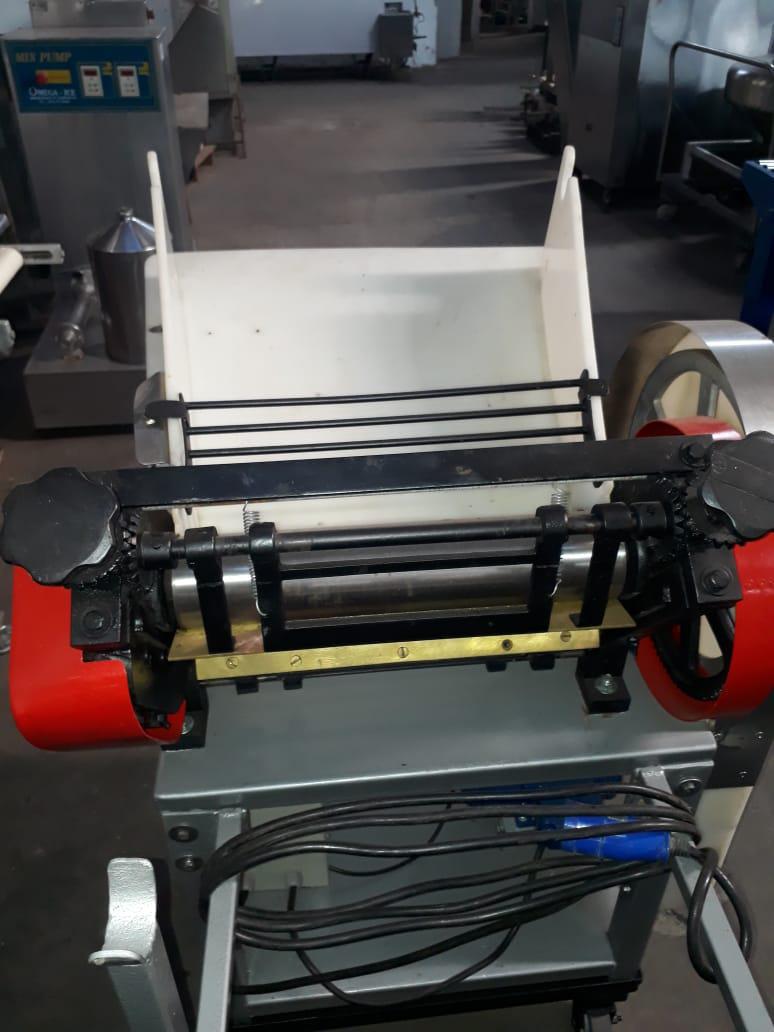 Cilindro 400 mm Indiana. Modelo: Rex Luxo. Equipamento com dois rolos laminadores para folha de massas, com mesa tubular em aço carbono e bica e apoios de massa em polipropileno. Equipamento indiacado para produção de lasanha e pastel.