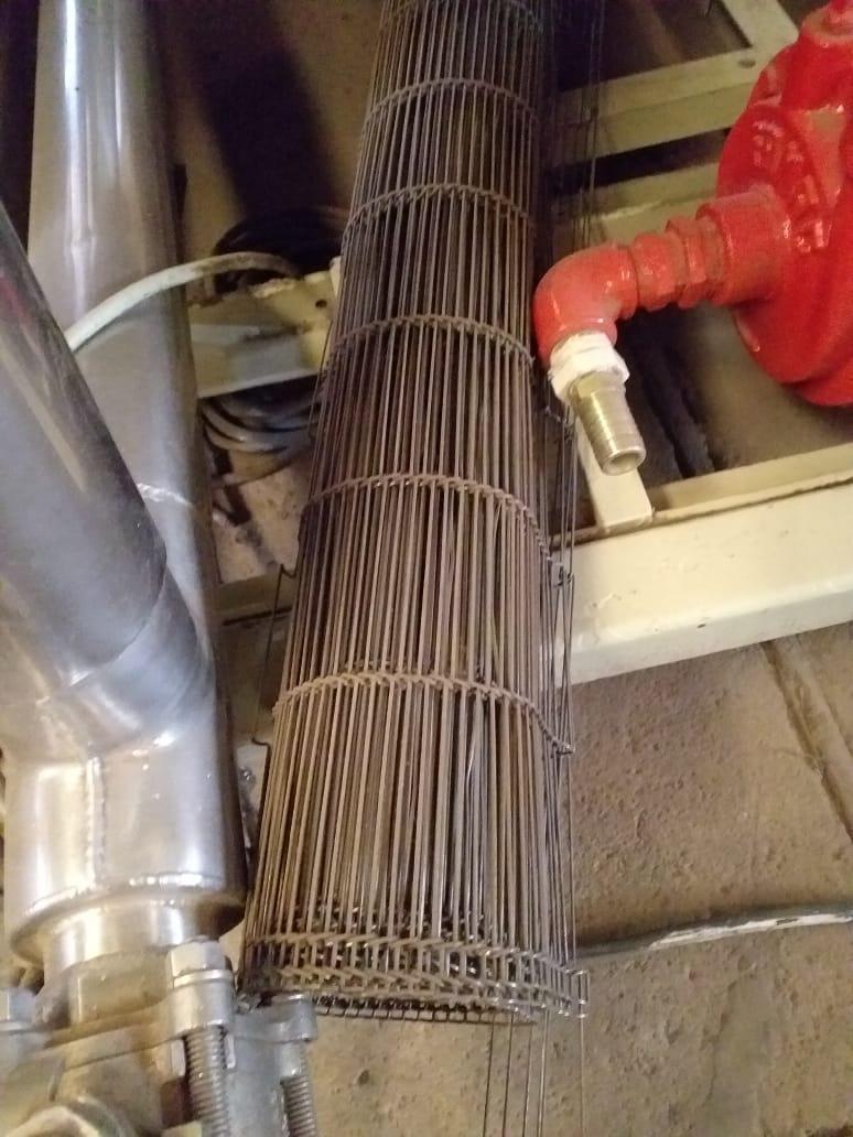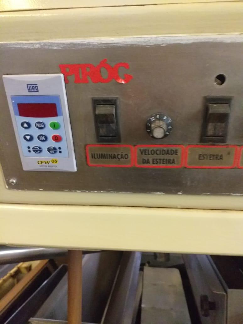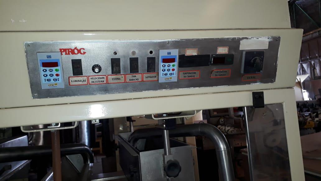Cobrideira de chocolates marca Piróg 1 m. Equipamento com sistemas vibratório, de raspadores e tirador de 'rabichos'. Com bombas inferior (lóbulo) e de retorno (engrenagem) da massa e controlador de temperatura e aquecimento interno. Área de cobertura: 1 m.