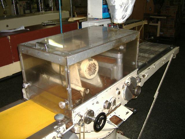 Conjunto de cobrideira e temperadeira acoplados Sollich. Capacidade temperadeira: 30 kG/h. Largura cobrideira: 280 mm.