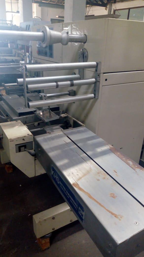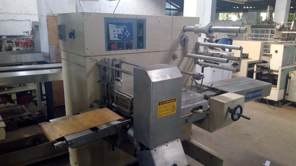 Embaladora Flow Pack. Marca: Otto Haensel. Modelo: Pack-Y. Equipamento com cabeçote escamoteável para filmes encolhíveis.