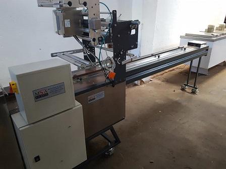 Embaladora Flowpack marca Klockner. Modelo: Pack 200. Produção: até 350 embalagens/minuto. Embaladora de fluxo horizontal, com servo motor, para filme selável a frio ou a quente, indicada para produtos de panificação, confeitaria, chocolates e outros. Temperatura máxima dos rolos seladores: até 350 graus. Temperatura máxima das lâminas seladoras: 350 graus. Atende a 24 formatos diferentes de pacotes.