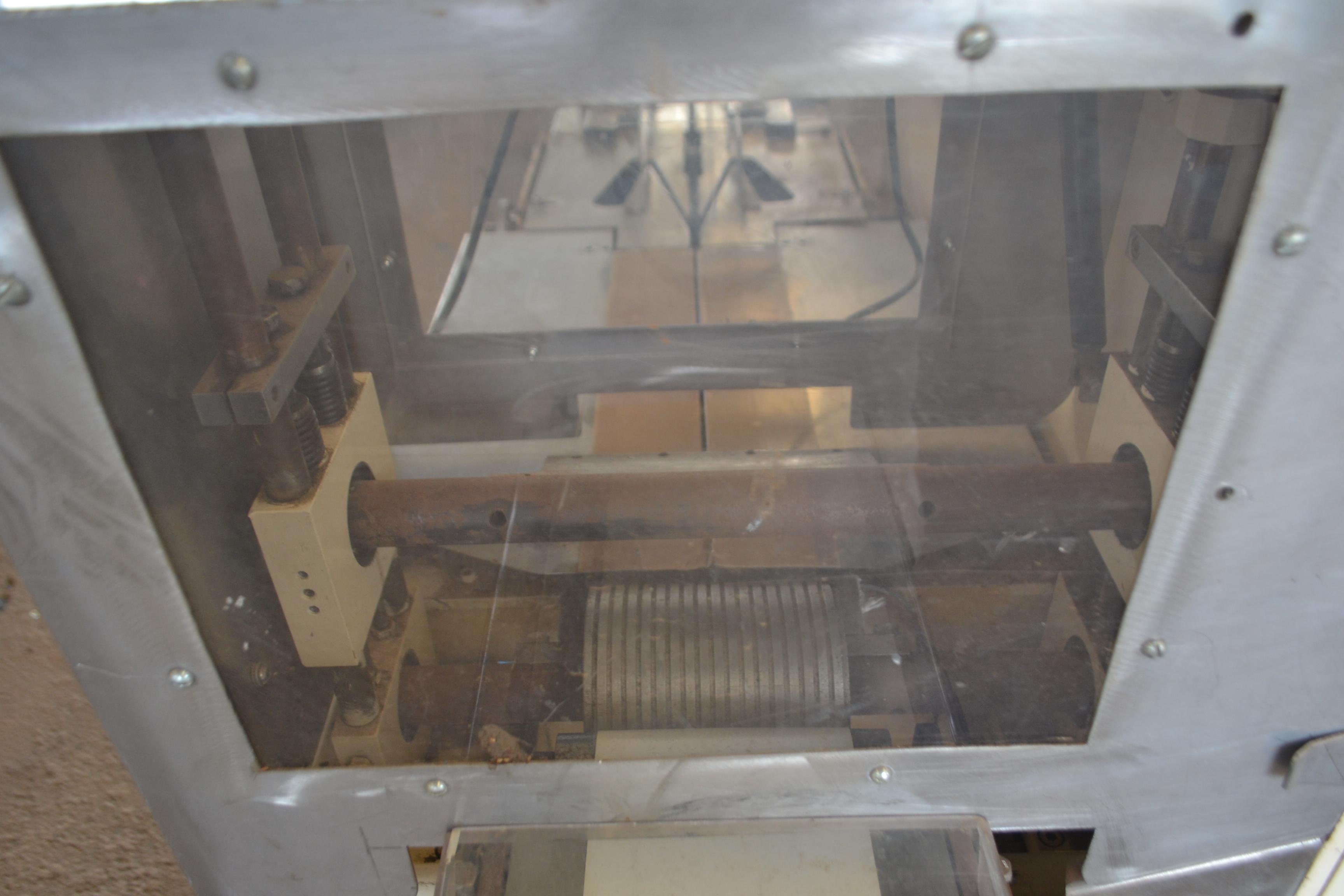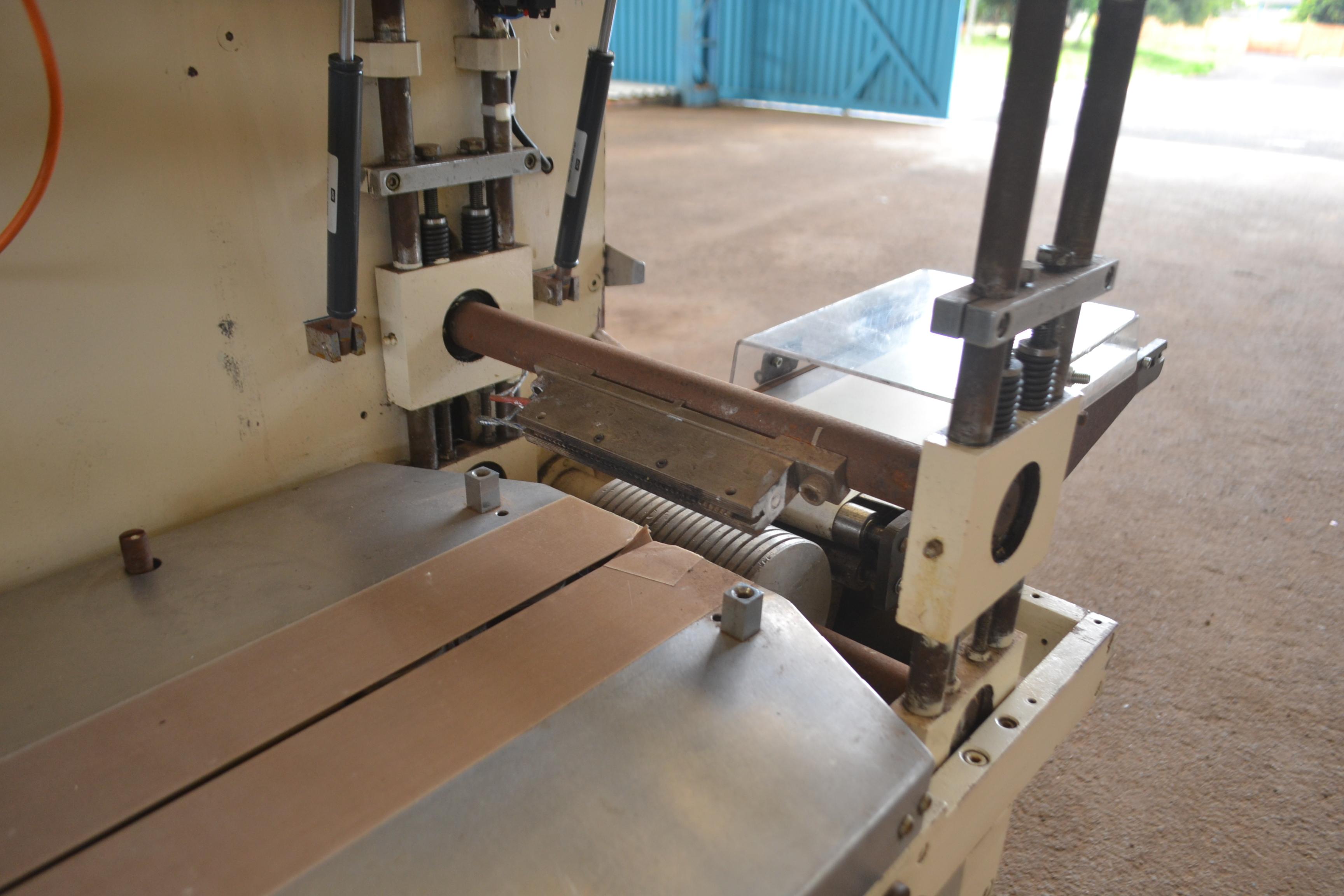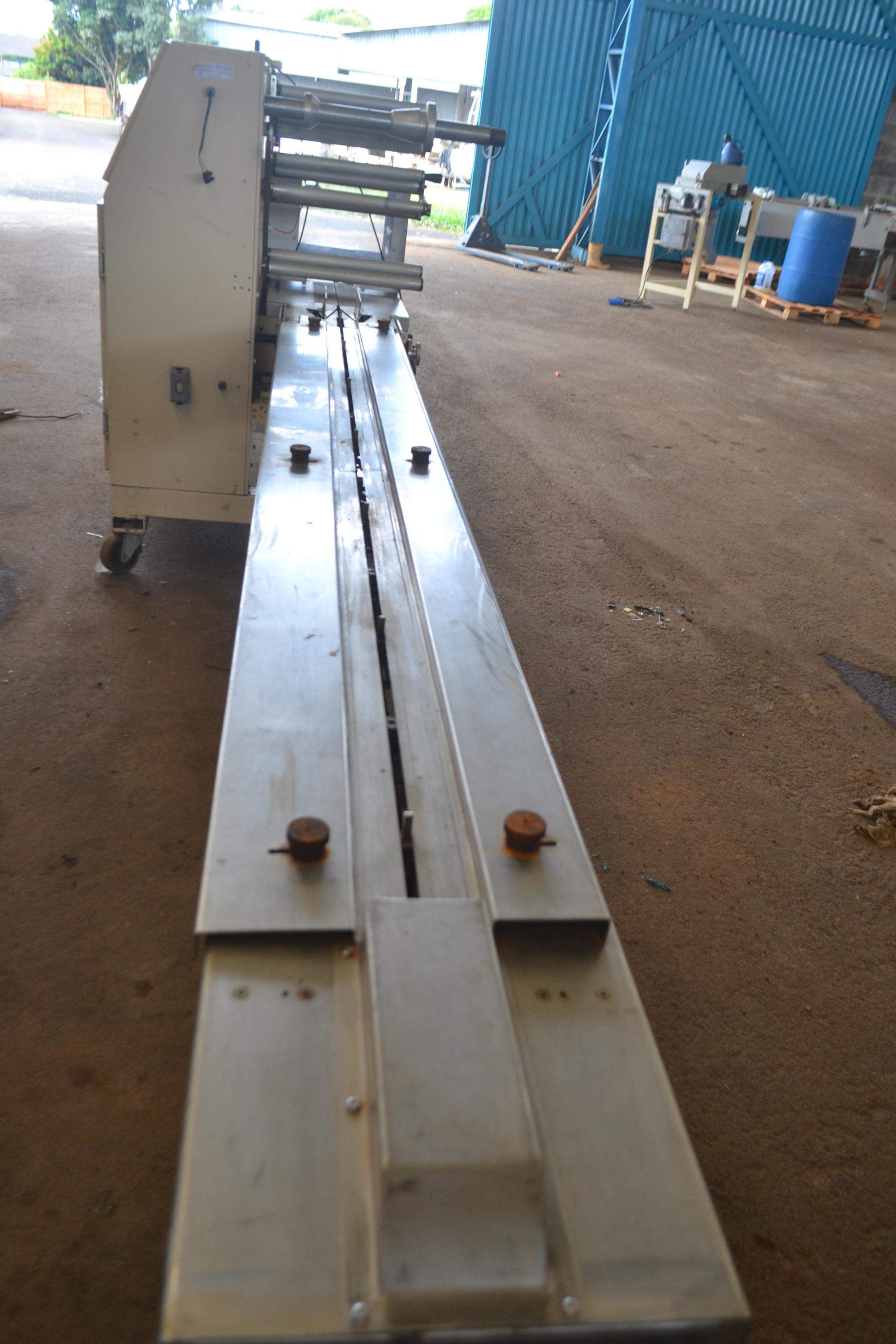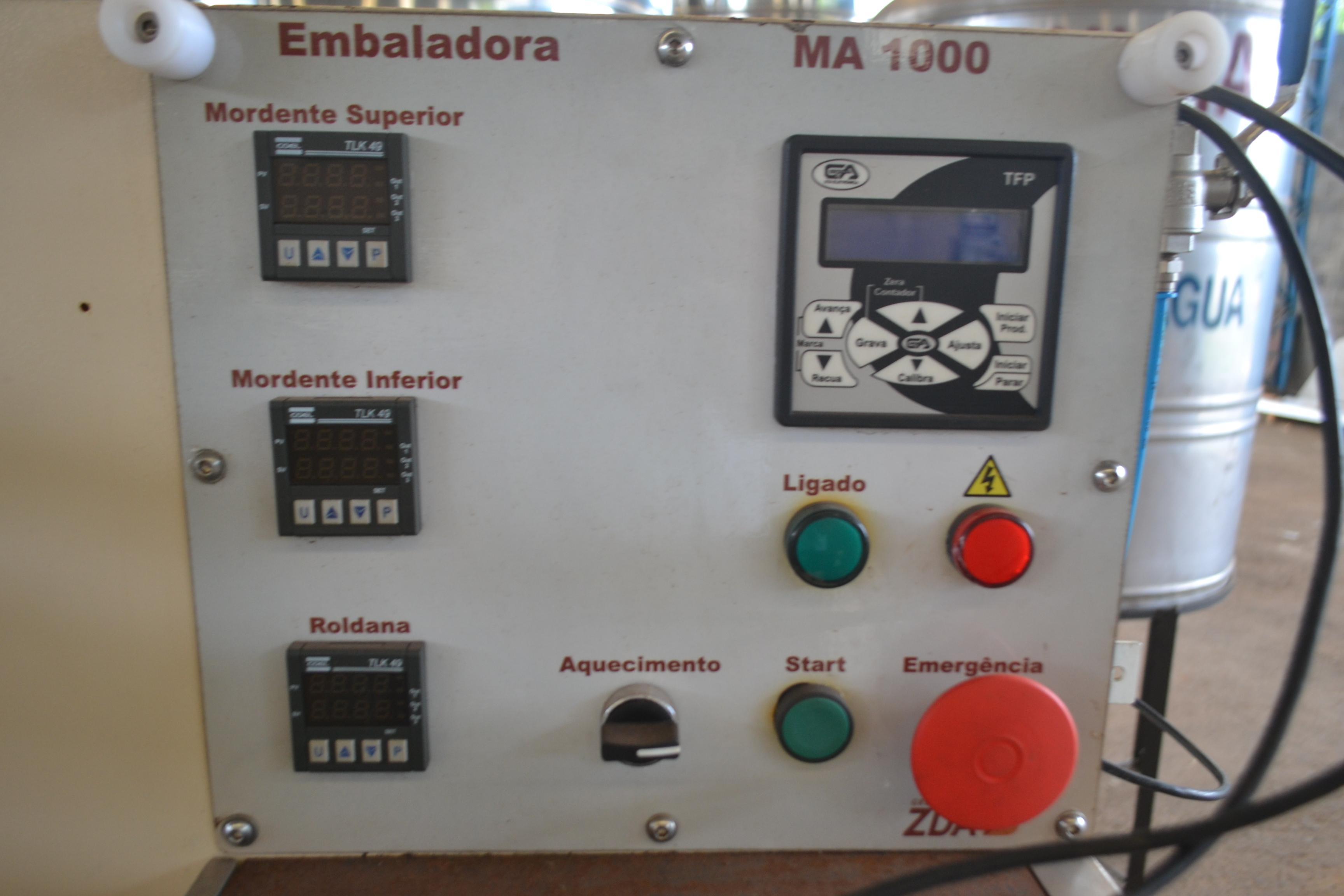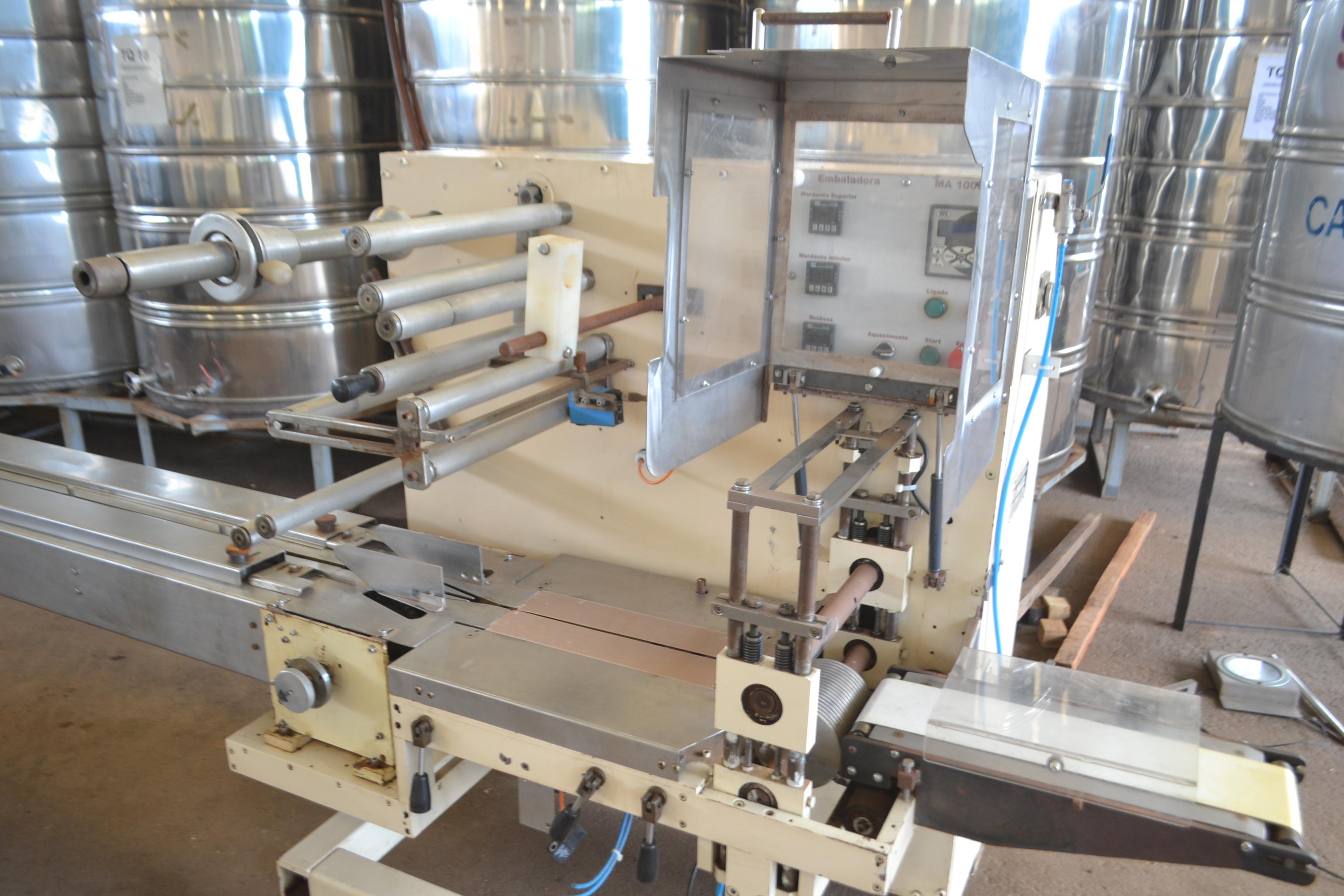 Embaladora flowpack marca Makweg para chocolates, doces e outros. Modelo: MA-1000. Produtividades: 80 unidades/ aproximadamente. Com CLP, fotocélula e mordente duplo. Dimensões: - Produção aprox.: 80 unidades/ min - Largura total: 1,00 m - Altura total: 1,50 m - Comprimento total: 4,50 m - Comprimento da esteira: 3 m.