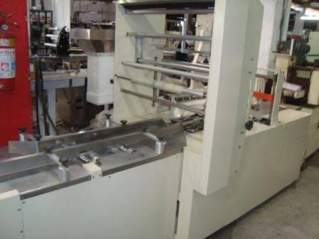 Embaladora Termo Encolhivel automática Weldotron. Equipamento com sistema de selagem transversal e de vácuo para filme térmico. Produção entre 40 (via única) e 80 (via dupla) unidades/min.