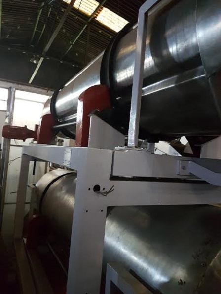 Secador Temperador rotativo contínuo, para snacks spandidos, marca Inbramaq. Constituído em aço inox 304 com estrutura em aço carbono.Medidas cilindros: 600 mm de diâmetro x 2 m de comprimento.
