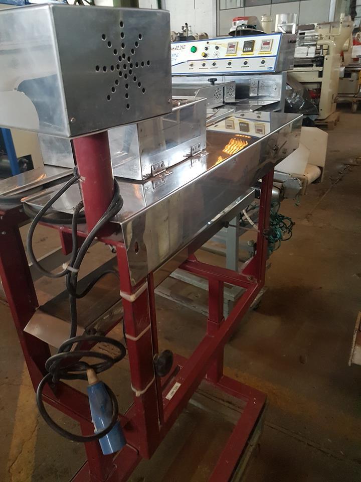 Seladora Automática JCV. Modelo JC 750. Equipamento com controle de temperatura digital, regulador de velocidade para o transporte automático da embalagem até a área de selagem de modo contínuo, apoio da embalagem com regulagem de altura. Produção: 15 mil pacotes dia. Duas unidades disponíveis.