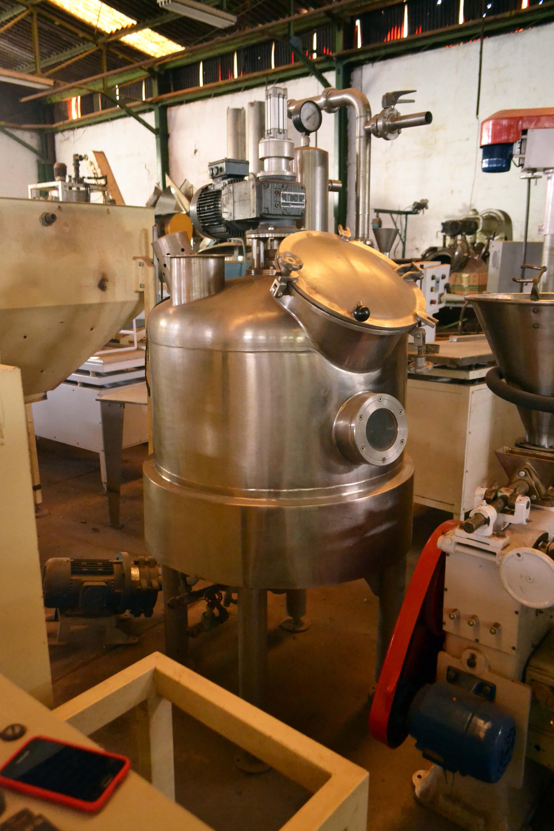 Cozinhador à vácuo em Aço Inox 300 litros marca Rotia Equipamento com meia cana de aquecimento à vapor, com motor e redutor. Possui tampa com pressão de fechamento, filtro e conexões em inox, manômetros, válvula e estrutura de alta resistência de pressão à vácuo.
