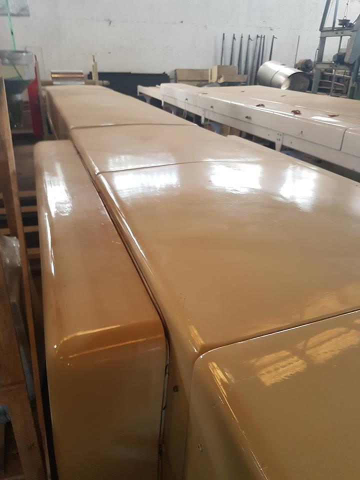Túnel de resfriamento Hebleimar 22 m x 600 mm. Características: 4 motores gerando 7,2 Kw de potência; controle de temperatura e controle da velocidade da esteira; esteira construída em PVC laminado.
